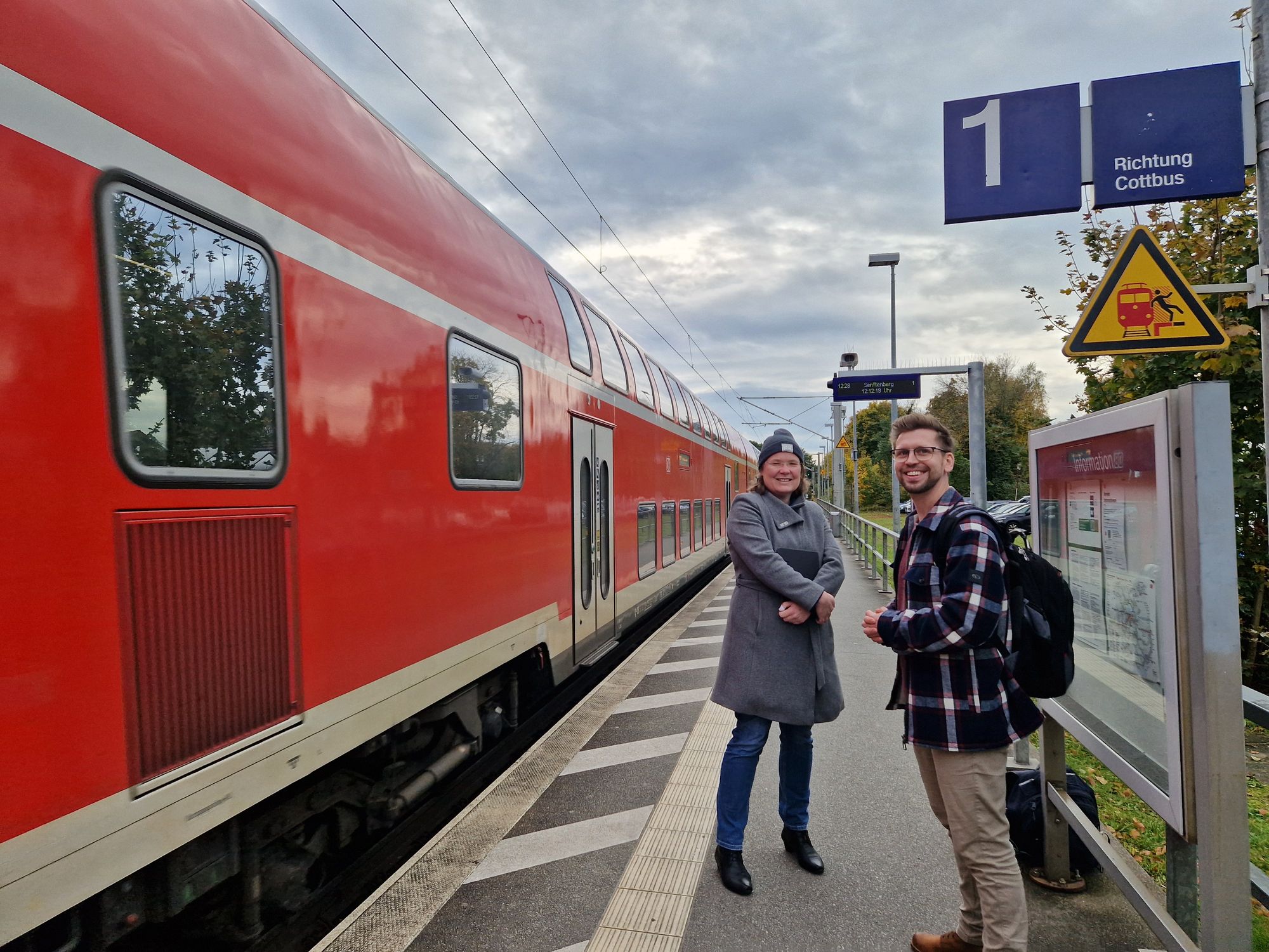 Das Bild kann unter Angabe der Quelle: „Andrea Lübcke (MdB)“ verwendet werden. v.l.n.r.: Andrea Lübcke und Samuel Neustupny auf dem Bahnhof Bestensee